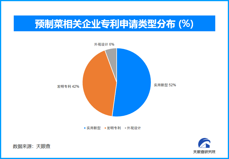 天眼查專業(yè)版數(shù)據(jù)顯示,在預(yù)制菜方面的相關(guān)專利申請共1225件,其中,實用新型專利和發(fā)明專利占比最高,分別占比52%和42%。這也充分體現(xiàn)預(yù)制菜便捷、快速并且擁有技術(shù)基因的特點。