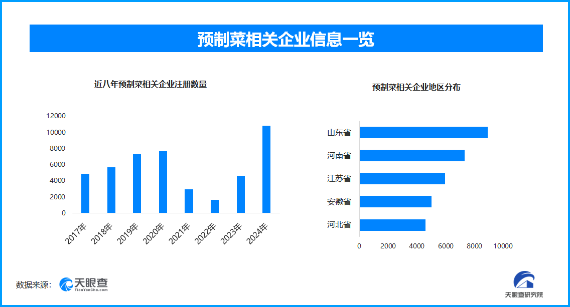 在企業(yè)布局方面,天眼查專業(yè)版數(shù)據(jù)顯示,截至目前,我國現(xiàn)存在業(yè)、存續(xù)狀態(tài)的預(yù)制菜相關(guān)企業(yè)超6.8萬家。其中,2024年截至目前新增注冊相關(guān)企業(yè)近1.1萬家,已達到近八年來的頂峰。