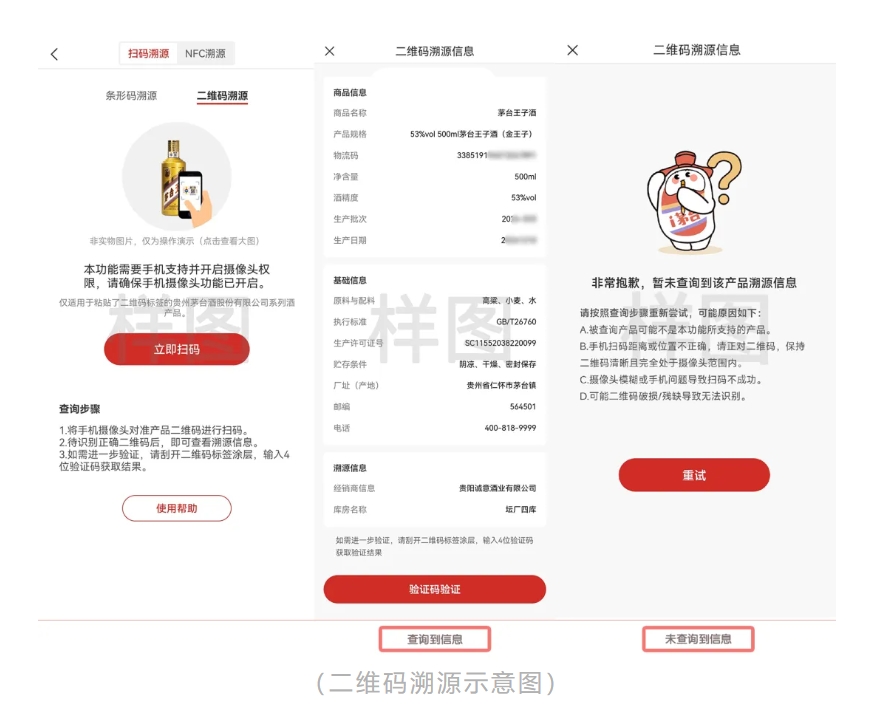 掃碼溯源:一是條形碼溯源,2022年5月19日及以后生產(chǎn)且粘貼了條形碼標(biāo)簽的貴州茅臺酒產(chǎn)品可通過“i茅臺App—我的—溯源”進(jìn)入“條形碼掃碼”頁面獲取產(chǎn)品的溯源信息。二是二維碼溯源,2025年1月15日及以后生產(chǎn)的茅臺王子酒(金王子)可通過“i茅臺App—我的—溯源”進(jìn)入“二維碼掃碼”頁面獲取產(chǎn)品的溯源信息。