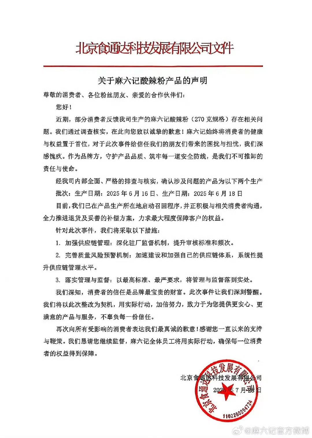 本報訊 (記者李靜)7月28日下午,麻六記官方微博發(fā)表聲明道歉,稱經(jīng)公司內(nèi)部排查與核實,確認(rèn)涉及問題的產(chǎn)品為生產(chǎn)日期為2025年6月16日、6月18日的兩個生產(chǎn)批次。麻六記稱,目前,公司已在產(chǎn)品生產(chǎn)所在地啟動召回程序,并正積極與相關(guān)消費者溝通,全力推進退貨及妥善的補償方案,力求最大程度保障客戶的權(quán)益。