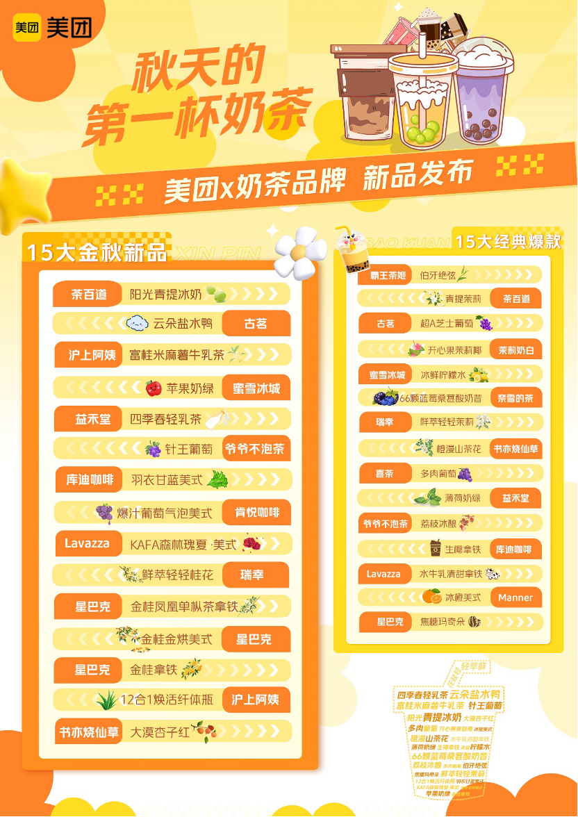 從網(wǎng)絡(luò)熱梗到每年“固定節(jié)目”,受年輕人歡迎的“秋天第一杯奶茶”,已經(jīng)連續(xù)5年帶動飲品消費潛力釋放,而各茶飲品牌在“秋天第一杯奶茶”期間,通過美團進行新品首發(fā),已成為行業(yè)重要趨勢。