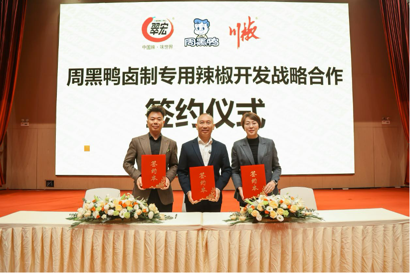 本報訊 (記者梁傲男)11月19日,周黑鴨國際控股有限公司(以下簡稱“周黑鴨”)鹵制專用辣椒開發(fā)戰(zhàn)略合作簽約儀式舉行。周黑鴨攜手四川翠宏食品有限公司(以下簡稱“四川翠宏食品”)、四川省川椒種業(yè)科技有限責任公司(以下簡稱“四川川椒種業(yè)”)達成深度合作,三方以優(yōu)勢互補為基礎(chǔ)、聯(lián)合創(chuàng)新為核心,共同開發(fā)適合鹵味產(chǎn)業(yè)應(yīng)用的辣椒新品種,這既是周黑鴨首次布局上游香辛料定制開發(fā),更是鹵味行業(yè)中首家達成香辛料定向開發(fā)的突破性舉措。