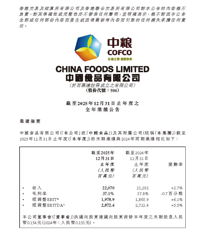 本報(bào)訊 (記者梁傲男)3月24日,中國食品有限公司(以下簡稱“中國食品”)發(fā)布的財(cái)報(bào)顯示,2025年,公司實(shí)現(xiàn)收入220.7億元,經(jīng)營溢利19.79億元,公司高質(zhì)量發(fā)展成效顯著,持續(xù)鞏固提質(zhì)增效、穩(wěn)健向好的發(fā)展態(tài)勢。