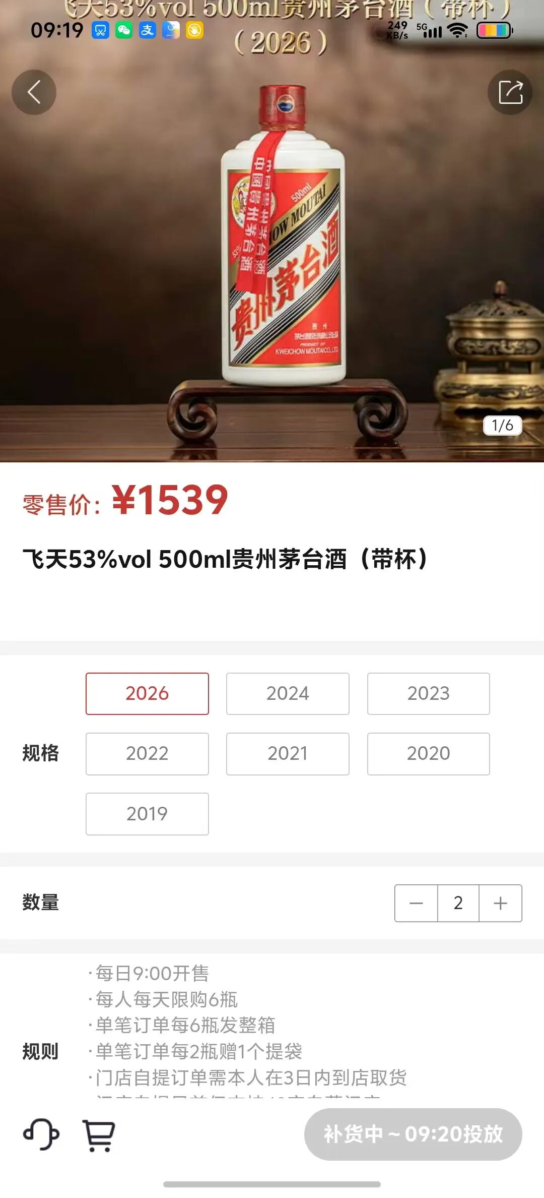 當日上午9點,筆者進入i茅臺APP看到,飛天53%vol500ml貴州茅臺酒價格已更新為1539元。除價格變化外,購酒流程與以往相比并無太多變化,依舊是選擇產(chǎn)品、點擊進入、選擇數(shù)量、立即購買的流程。但消費者購酒的熱情絲毫未減,大量消費者進入i茅臺平臺購買飛天茅臺酒。從上午9點至9點半之間,平臺雖每隔五分鐘便進行一次補貨,但每次補貨后均迅速售罄。