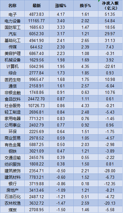 從申萬(wàn)一級(jí)行業(yè)來(lái)看,有24類行業(yè)上漲,電子居首,漲幅達(dá)4.17%,電力設(shè)備、國(guó)防軍工、汽車等行業(yè)漲幅均超3%;此外,有7類行業(yè)下跌,煤炭跌幅居首,達(dá)1.50%,農(nóng)林牧漁、石油石化、房地產(chǎn)等跌幅也超過(guò)1%。
