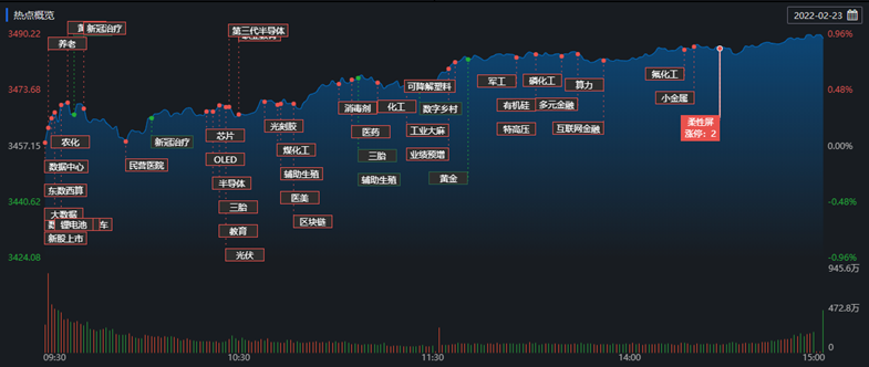 盤(pán)面來(lái)看,截至2月23日收盤(pán),上證指數(shù)漲0.93%,深證成指漲1.9%,創(chuàng)業(yè)板指漲2.82%;滬深兩市合計(jì)成交額10409億元,突破一萬(wàn)億元;總體來(lái)看,兩市個(gè)股普漲,有3608只個(gè)股上漲,其中有104只個(gè)股漲停報(bào)收。