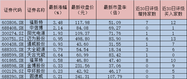 進(jìn)一步梳理發(fā)現(xiàn),在30只個(gè)股中,賽伍技術(shù)、大金重工、中信博、金博股份、通威股份、帝科股份、航天機(jī)電、大全能源、隆基股份等9只個(gè)股最新收盤(pán)價(jià)較機(jī)構(gòu)給予的最高目標(biāo)價(jià),仍有60%以上的上升空間。