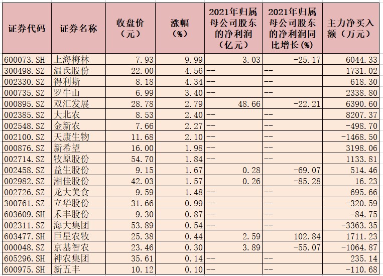 表:4月11日上漲的豬肉概念股一覽