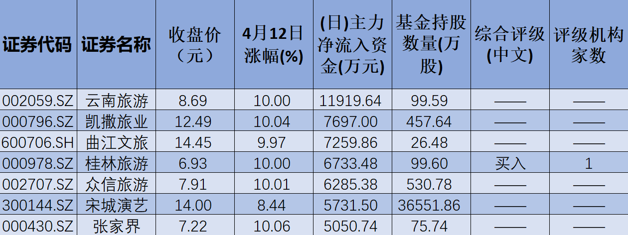 表:4月12日,景點及旅游板塊獲得大單資金凈流入額超5000萬元個股一覽