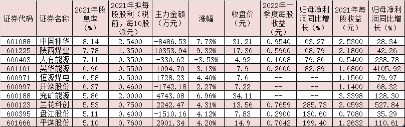 上述21家擬分紅的煤炭公司中,以4月28日收盤價(jià)計(jì)算,有18家公司2021年股息率有望超過銀行一年定存利率(1.75%)。其中,有10只個(gè)股股息率有望超5%。