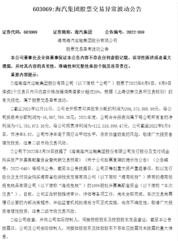 公告還顯示,公司于2022年5月28日披露了《海南海汽運(yùn)輸集團(tuán)股份有限公司發(fā)行股份及支付現(xiàn)金購買資產(chǎn)并募集配套資金暨關(guān)聯(lián)交易預(yù)案》《關(guān)于公司股票復(fù)牌的提示性公告》(公告編號(hào):2022-049)等相關(guān)公告,截至本公告披露日,公司正籌劃重大資產(chǎn)重組事項(xiàng),擬以發(fā)行股份及支付現(xiàn)金購買海南省旅游投資發(fā)展有限公司(以下簡稱“海南旅投”)持有的海南旅投免稅品有限公司(以下簡稱“海旅免稅”)的100%股權(quán)并募集配套資金(以下簡稱“本次交易”)。目前,公司正在積極推進(jìn)審計(jì)、評(píng)估等各項(xiàng)工作,尚未全部完成。本次交易尚需履行必要的內(nèi)部決策程序,并經(jīng)監(jiān)管機(jī)構(gòu)批準(zhǔn)后方可正式實(shí)施,尚存不確定性。敬請(qǐng)廣大投資者理性投資,注意二級(jí)市場交易風(fēng)險(xiǎn)。