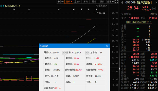 6月10日,海汽集團(tuán)繼續(xù)漲停,這是該股實(shí)現(xiàn)14連陽走勢(shì),且最近9個(gè)交易日均實(shí)現(xiàn)一字漲停板,14日累計(jì)漲幅達(dá)181.43%。截至今日收盤,海汽集團(tuán)報(bào)28.34元,成交額達(dá)1.65億元,換手率1.84%,買一封單達(dá)218085手。