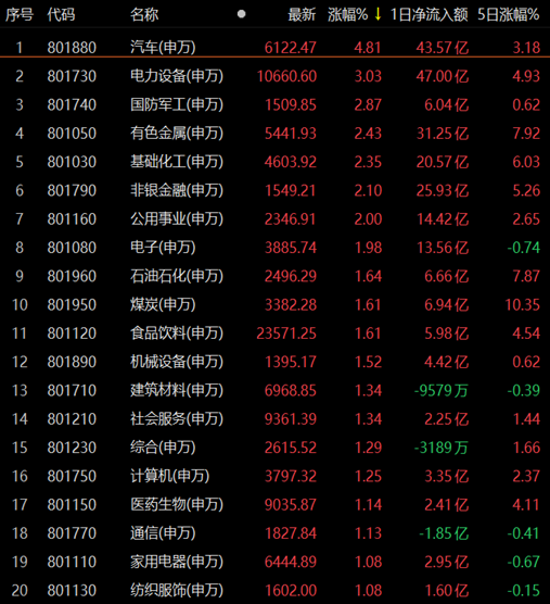 從申萬一級(jí)行業(yè)看,汽車行業(yè)漲幅居前,收?qǐng)?bào)6122.47點(diǎn),漲幅達(dá)4.81%。