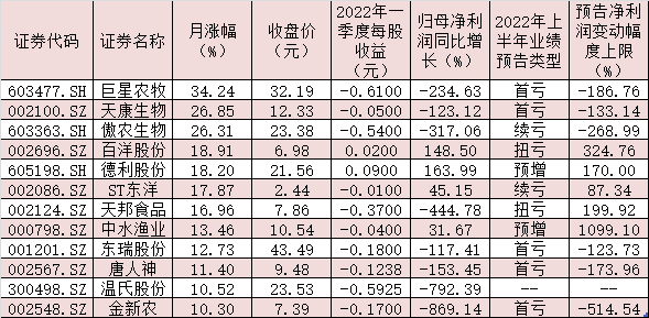 表:7月份以來漲幅超10%的農林牧漁股一覽
