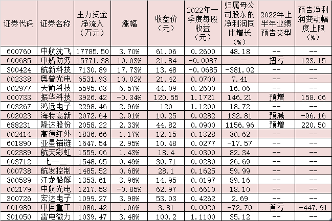 表:7月27日受到超千萬(wàn)元主力資金追捧的國(guó)防軍工股