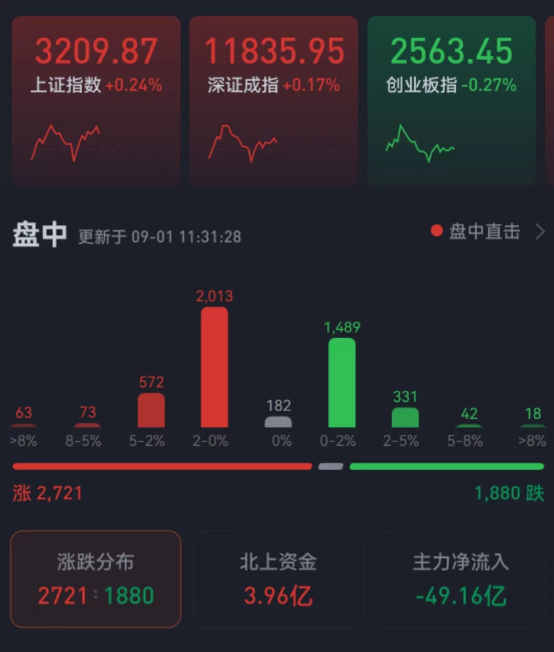 周四(9月1日),三大股指震蕩分化,漲跌不一。截至上午收盤,上證指數(shù)漲幅達(dá)0.24%,報(bào)3209.87點(diǎn);深證成指漲幅為0.17%,創(chuàng)業(yè)板指微跌0.27%;滬深兩市合計(jì)成交額4858.4億元,總體來看,兩市個(gè)股漲多跌少。
