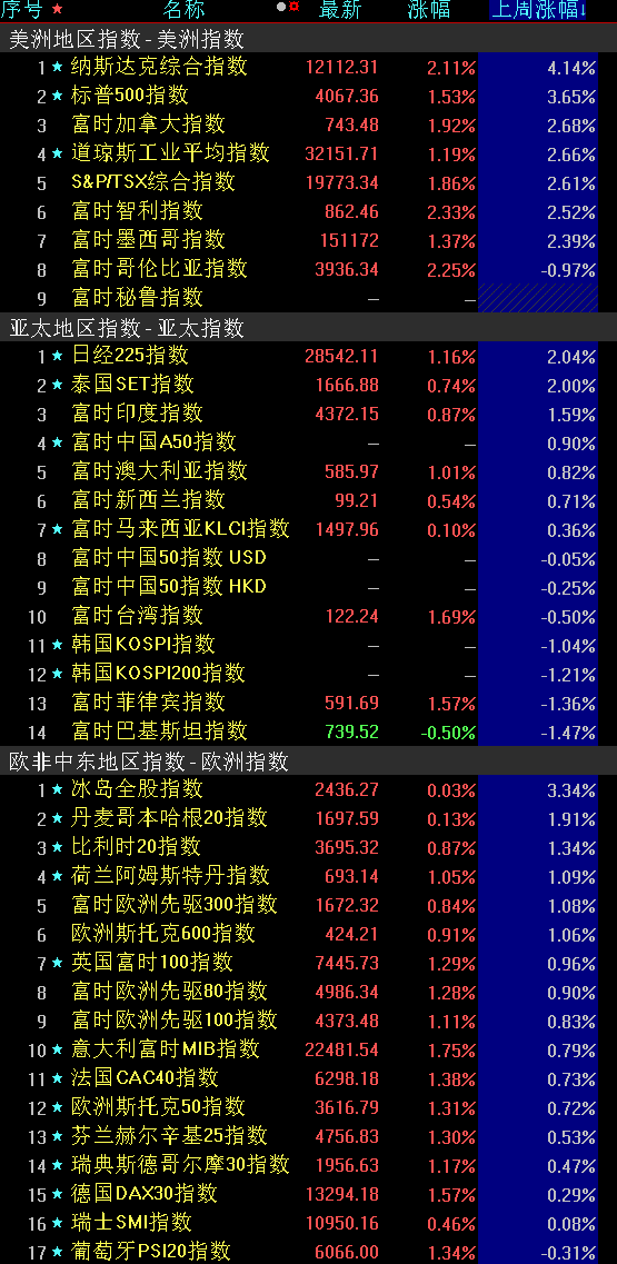 上周美股三大指數(shù)上漲,道指周漲2.66%;標(biāo)普500指數(shù)周漲3.65%;納指周漲4.14%。歐洲方面,三大股指周線上漲,英國(guó)富時(shí)100指數(shù)周累計(jì)漲0.96%,德國(guó)DAX30指數(shù)周累計(jì)漲0.29%,法國(guó)CAC40指數(shù)周累計(jì)漲0.73%。亞太股市,日經(jīng)225指數(shù)周累計(jì)漲2.04%;韓國(guó)KOSPI指數(shù)周累計(jì)跌1.04%。