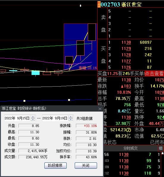 9月19日,熱門股浙江世寶再度漲停,截至收盤,報11.30元,實現(xiàn)3連板,累計漲幅達33.1%。
