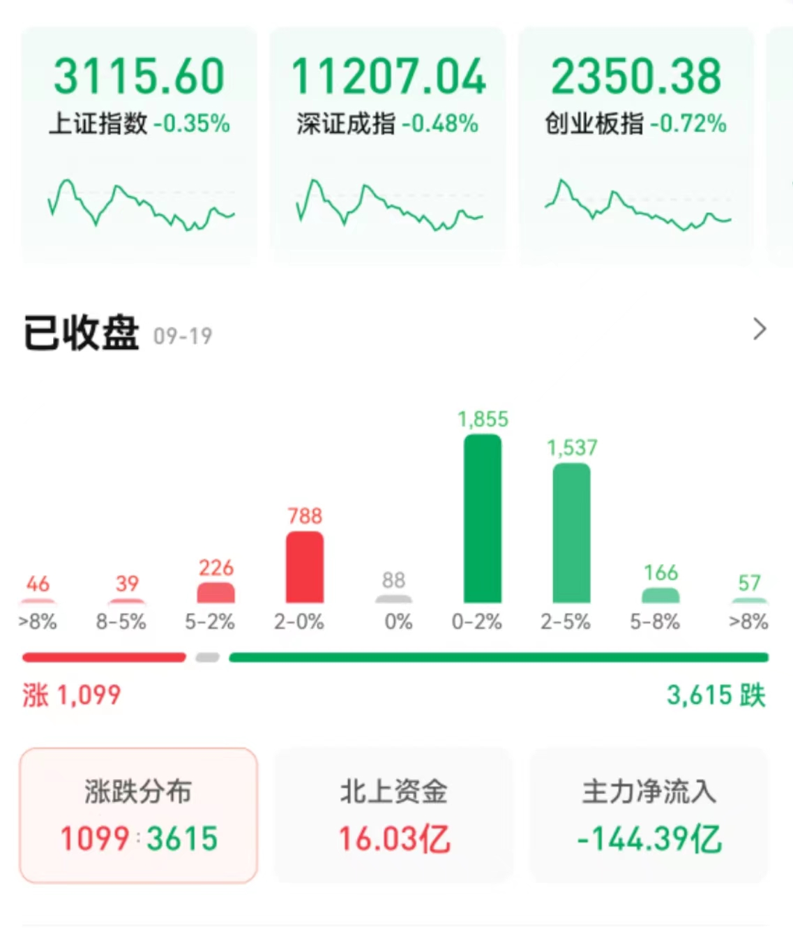9月19日,A股三大指數(shù)震蕩回落,集體收跌。截至收盤,上證指數(shù)跌0.35%報3115.6點,深證成指跌0.48%報11207.04點,創(chuàng)業(yè)板指跌0.72%報2350.38點,走出了日線五連陰的態(tài)勢。兩市合計成交6653億元,成交額創(chuàng)年內(nèi)新低。總體來看,A股個股跌多漲少,上漲個股為1099只,下跌個股3615只。
