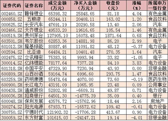 值得關(guān)注的是,今日北向資金凈買入金額達16.03億元。其中,滬港通凈買入金額達6.70億元,深股通凈買入金額達9.32億元。從前十大成交活躍股來看,今日,贛鋒鋰業(yè)、五糧液、長安汽車等3只個股,北向資金凈買入金額均超2億元。