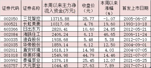 表:本周以來受到千萬元以上主力資金追捧的空氣源熱泵概念股