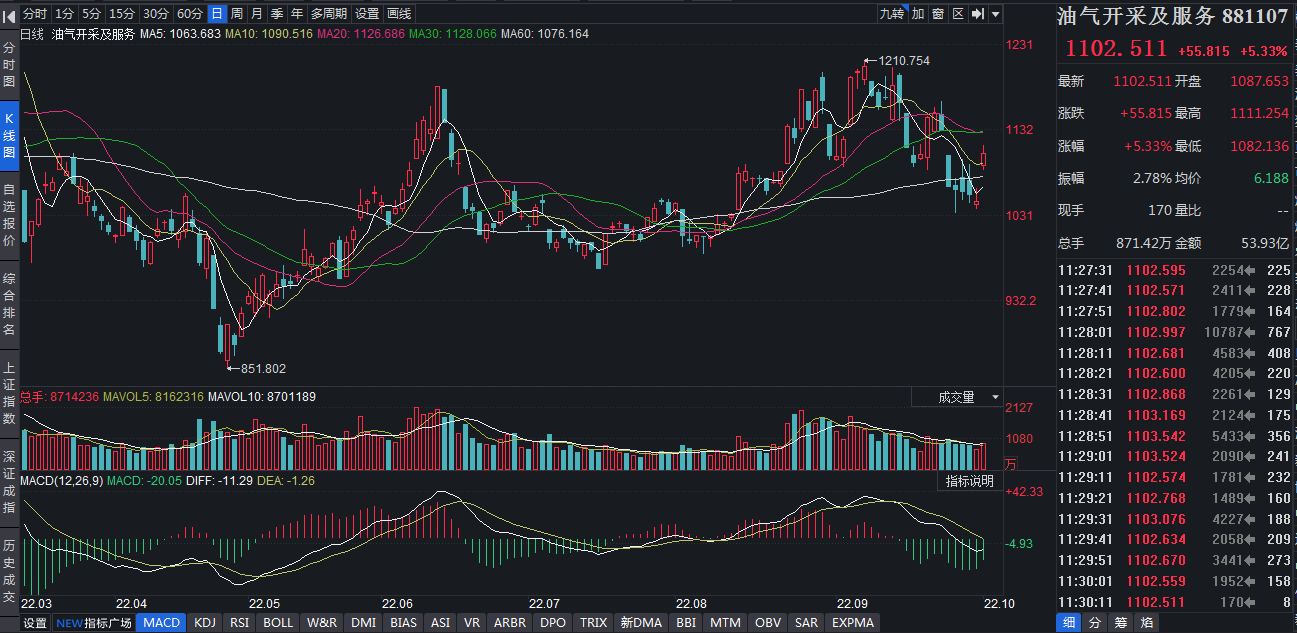 受國際油價(jià)顯著反彈等因素的影響,10月10日,A股同花順油氣開采及服務(wù)板塊表現(xiàn)強(qiáng)勢(shì),截至11:30,油氣開采及服務(wù)板塊指數(shù)漲5.33%,位居同花順行業(yè)漲幅榜前列,大幅跑贏上證指數(shù)(跌幅0.39%)。板塊內(nèi)21只個(gè)股全部實(shí)現(xiàn)上漲,其中,貝肯能源漲停。