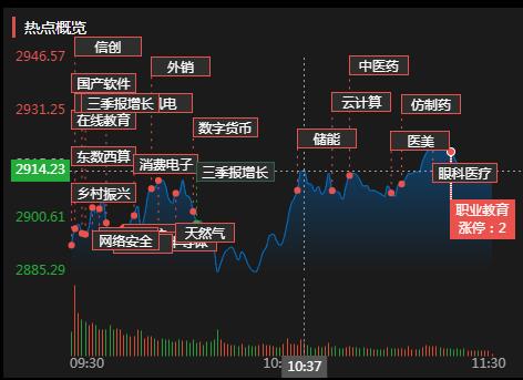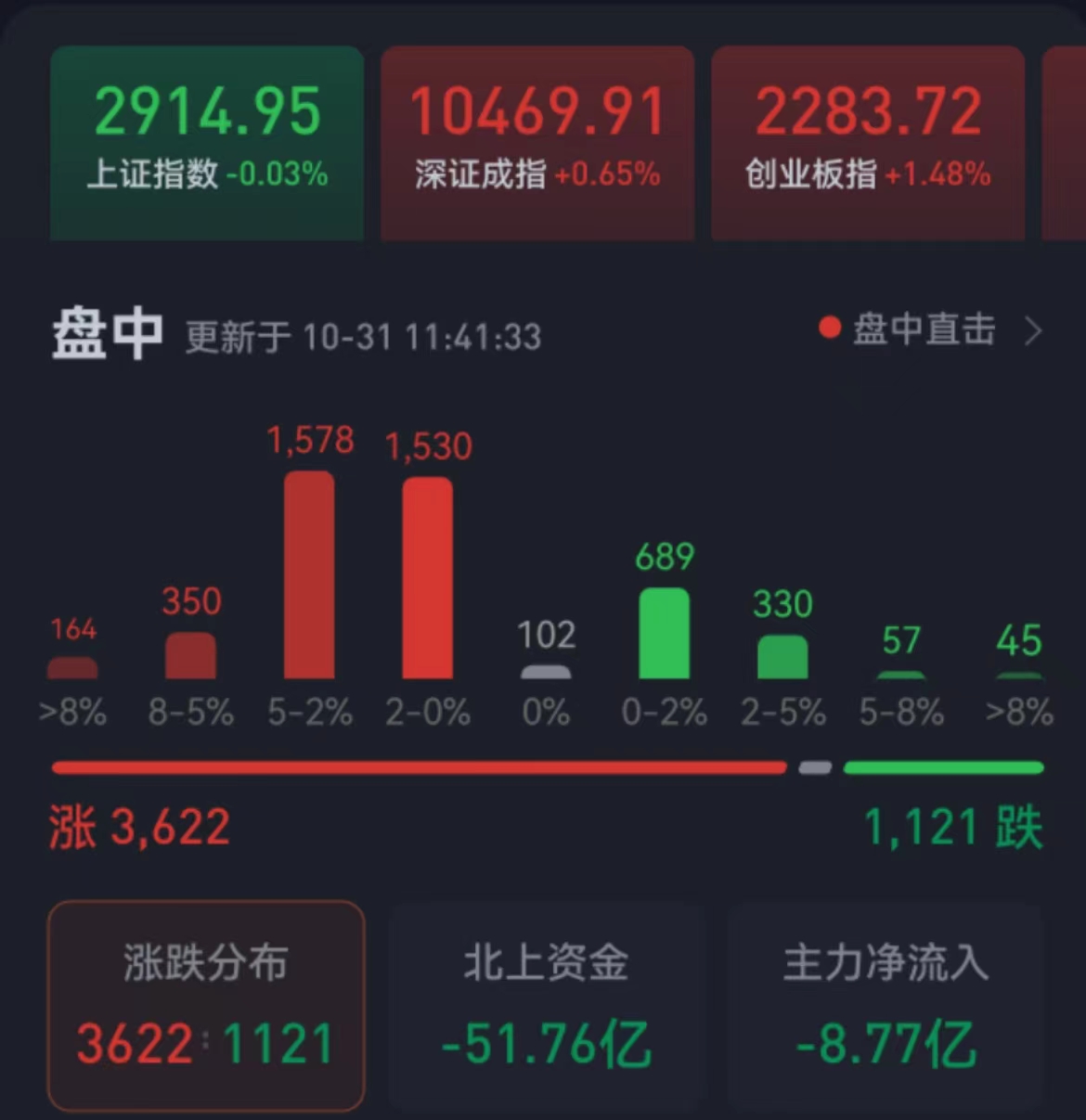 周一(10月31日),三大股指震蕩分化,漲跌不一。截至上午收盤,上證指數(shù)下跌0.03%,報(bào)2914.95點(diǎn);深證成指和創(chuàng)業(yè)板指漲幅分別為0.65%和1.48%;滬深兩市合計(jì)成交額5808.76億元,總體來看,兩市個股漲多跌少。