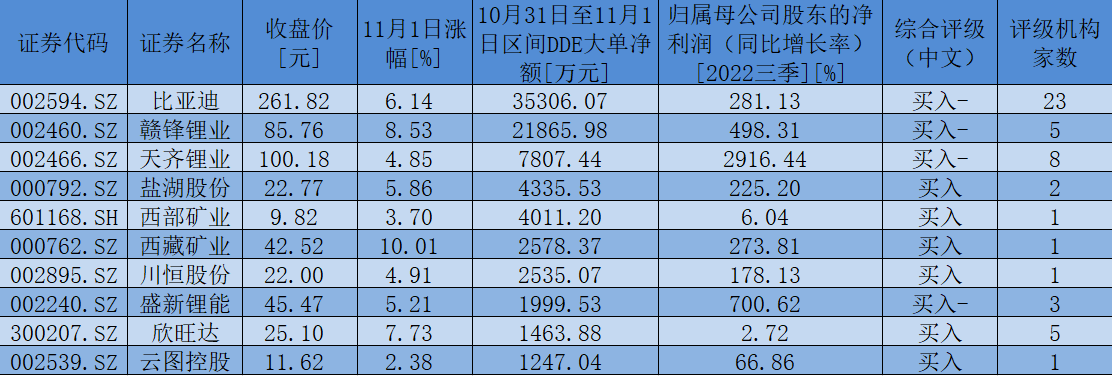 表:10月31日至11月1日,獲大單資金凈流入額超1000萬元的鹽湖提鋰板塊個股一覽