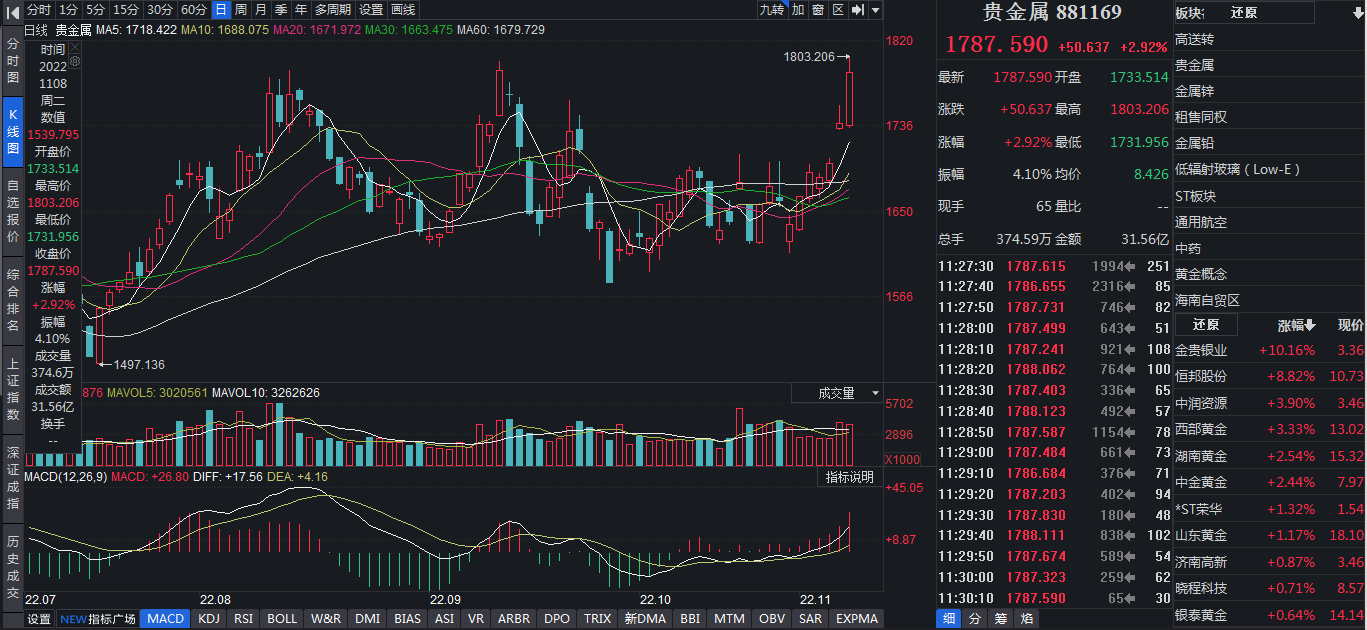 在貴金屬價格上行帶動下,A股貴金屬板塊也比較強(qiáng)勢。11月8日,截至11:30,同花順貴金屬行業(yè)板塊上漲2.92%,位居同花順行業(yè)漲幅榜榜首。個股方面,金貴銀業(yè)漲停。