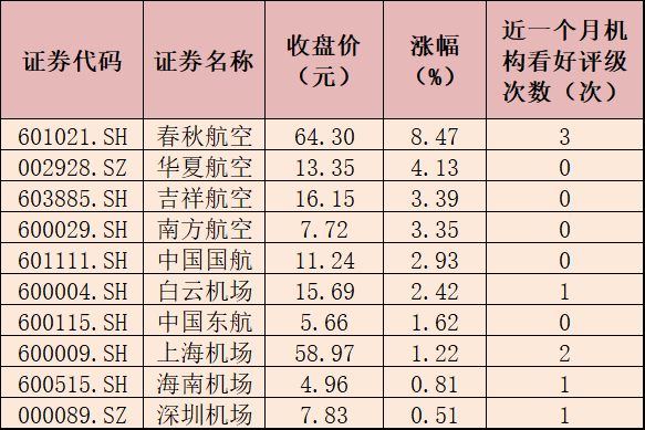 最近一個(gè)月,有機(jī)構(gòu)對(duì)于部分機(jī)場(chǎng)航運(yùn)概念股表示看好,具體來(lái)看,有5只個(gè)股獲機(jī)構(gòu)給予“買入”或“增持”等看好評(píng)級(jí),其中,春秋航空獲得看好評(píng)級(jí)次數(shù)最多,為3次,上海機(jī)場(chǎng)、白云機(jī)場(chǎng)、海南機(jī)場(chǎng)、深圳機(jī)場(chǎng)獲得看好評(píng)級(jí)次數(shù)分別為2次、1次、1次、1次。