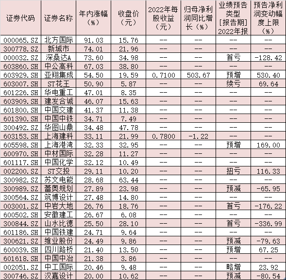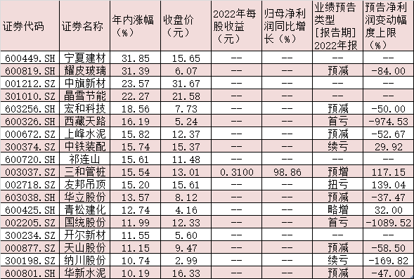 年報(bào)業(yè)績方面,同花順數(shù)據(jù)顯示,截至3月16日,已有14家建筑裝飾行業(yè)上市公司披露了2022年業(yè)績快報(bào),9家公司2022年全年實(shí)現(xiàn)歸母凈利潤同比增長,占比超六成;截至目前,有74家公司披露了2022年全年業(yè)績預(yù)告,20家公司業(yè)績預(yù)喜。此外,截至3月16日,有10家建筑材料行業(yè)上市公司披露了2022年業(yè)績快報(bào),5家公司2022年全年實(shí)現(xiàn)歸母凈利潤同比增長,占比五成;截至目前,有43家公司披露了2022年全年業(yè)績預(yù)告,6家公司業(yè)績預(yù)喜。