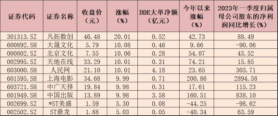 6月5日,傳媒板塊走強,截至收盤,傳媒板塊漲3.43%,位列同花順板塊漲幅榜第三,其中,包括凡拓數(shù)創(chuàng)、大晟文化、北京文化、天地在線、人民網(wǎng)等在內10只概念股集體漲停。