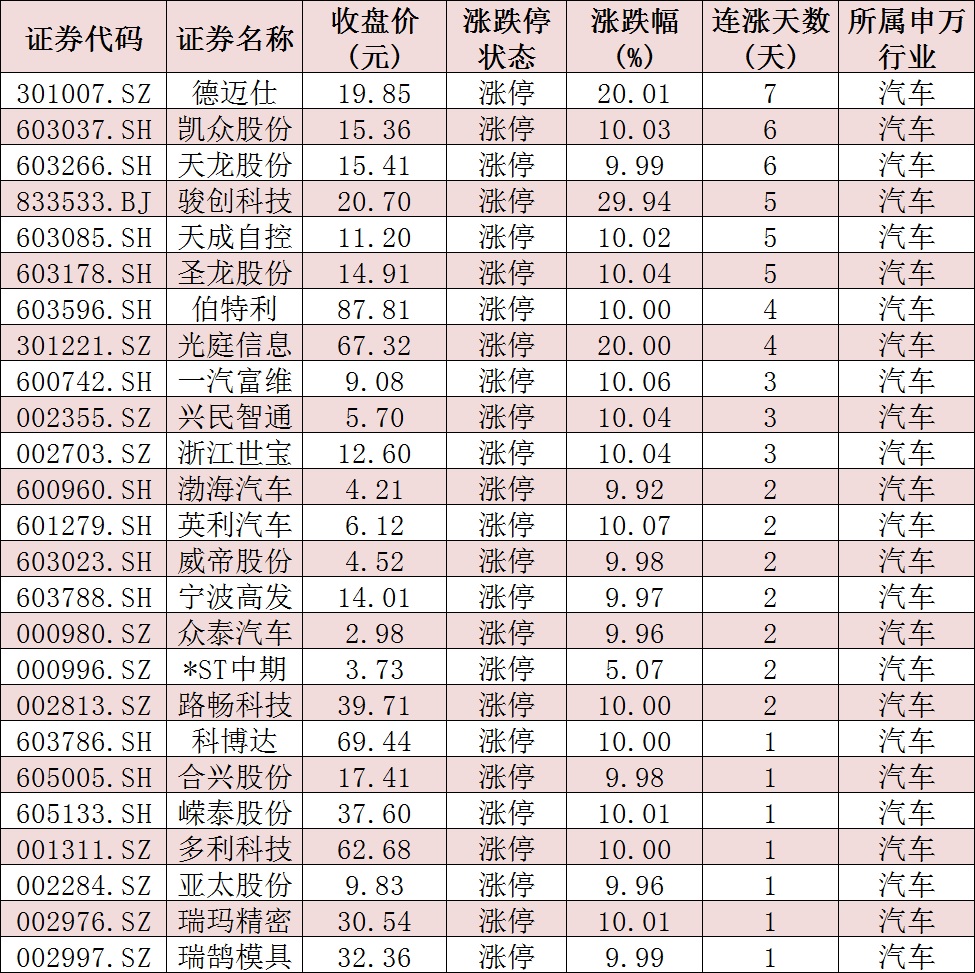 具體來看,今日,汽車產(chǎn)業(yè)鏈徹底爆發(fā),掀起了罕見的漲停潮,其中,胎壓監(jiān)測(cè)板塊領(lǐng)漲,路暢科技等5只個(gè)股漲停;新能源汽車概念股持續(xù)強(qiáng)勢(shì),包括德邁仕、英利汽車等多只概念股漲停;無人駕駛板塊持續(xù)走強(qiáng),得潤電子等16只概念股漲停;汽車零部件股集體走強(qiáng),圣龍股份等23只個(gè)股漲停;創(chuàng)新藥概念股午后異動(dòng),海思科、通化金馬漲停;EDR概念、華為汽車、減速器、汽車芯片、車聯(lián)網(wǎng)、傳感器、英偉達(dá)概念、第三代半導(dǎo)體等板塊表現(xiàn)活躍。中船系板塊領(lǐng)跌,芬太尼、醫(yī)藥商業(yè)、毛發(fā)醫(yī)療、醫(yī)藥電商、房地產(chǎn)服務(wù)、電力、教育、銀行等板塊跌幅居前。