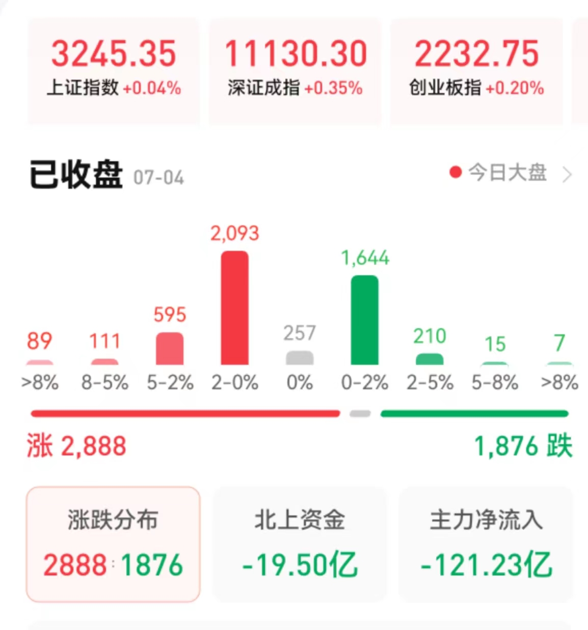 周二(7月4日),A股三大股指震蕩上行,全線飄紅。截至收盤,上證指數(shù)微漲0.04%報(bào)3245.35點(diǎn),深證成指漲0.35%報(bào)11130.3點(diǎn),創(chuàng)業(yè)板指漲0.2%報(bào)2232.75點(diǎn),兩市合計(jì)成交金額達(dá)9293億元,北向資金凈賣出19.5億元??傮w上看,兩市個(gè)股漲多跌少。其中,漲停個(gè)股達(dá)60只,跌停個(gè)股5只。