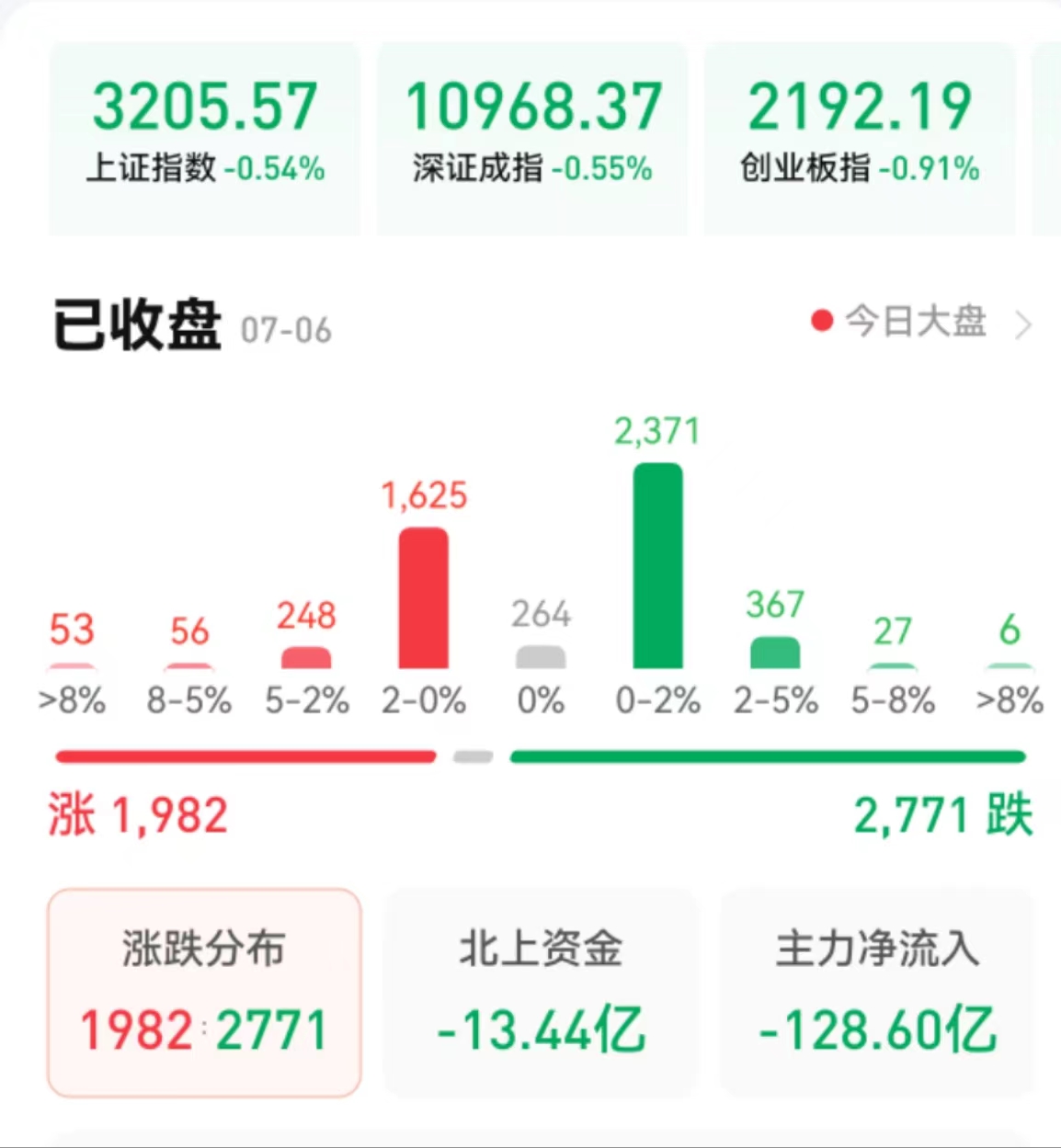 周四(7月6日),A股三大股指震蕩下行,略有回落。截至收盤,上證指數(shù)跌0.54%報(bào)3205.57點(diǎn),深證成指跌0.55%報(bào)10968.37點(diǎn),創(chuàng)業(yè)板指跌0.91%報(bào)2192.19點(diǎn),兩市合計(jì)成交金額達(dá)8198億元,北向資金凈賣出13.44億元??傮w上看,兩市個(gè)股跌多漲少。其中,漲停個(gè)股達(dá)38只,跌停個(gè)股6只。