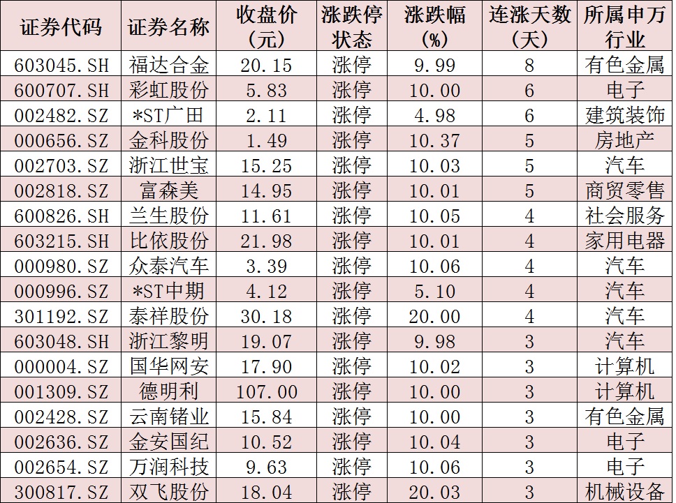 表:連續(xù)上漲3日且今日收盤漲停個(gè)股情況:
