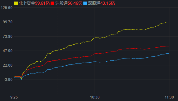 從資金面來(lái)看,7月13日上午,北上資金凈買入金額達(dá)99.61億元,其中,滬股通凈買入56.46億元,深股通凈買入43.16億元。