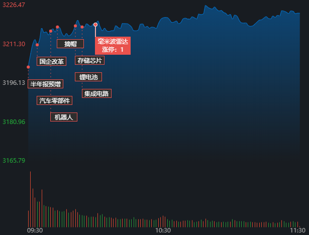 7月13日早盤,A股三大指數(shù)震蕩回升,呈深強(qiáng)滬弱格局。截至上午11:30,上證指數(shù)漲0.86%,報(bào)3223.49點(diǎn),深證成指和創(chuàng)業(yè)板指漲幅分別為1.13%和1.41%;滬深兩市成交額合計(jì)5529.2億元,較上一交易日同期增長(zhǎng)2.46%。A股市場(chǎng)有3441只個(gè)股上漲,1552只下跌,漲跌停方面,有27只個(gè)股漲停,跌停股8只。