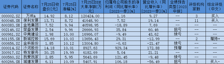 表:7月25日,房地產(chǎn)行業(yè)獲大單資金凈流入額超5000萬(wàn)元個(gè)股一覽