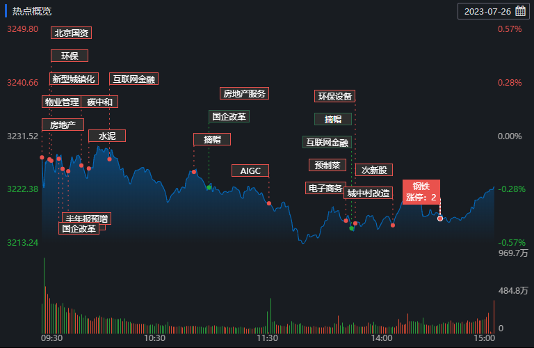 7月26日,三大指數(shù)略低開,盤中震蕩,周二強(qiáng)勢的房地產(chǎn)和環(huán)保板塊繼續(xù)保持強(qiáng)勢,貴金屬則異軍突起。截至收盤,上證指數(shù)跌0.26%報3223.03點;深證成指跌0.47%報10968.98點,創(chuàng)業(yè)板指跌0.08%報2191.17點。A股合計成交額7930.86億元,較前一交易日縮減16.44%;北向資金全天凈買入5.15億元;其中滬股通凈買入9.51億元,深股通凈賣出4.36億元。今日A股有2126只上漲,2945只下跌,漲跌比為0.72。
