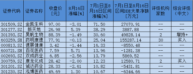 表:7月1日至8月16日,CRO概念板塊區(qū)間漲幅超10%個(gè)股一覽
