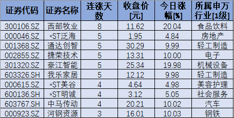 表:連續(xù)上漲3日且今日以漲停價報收個股一覽