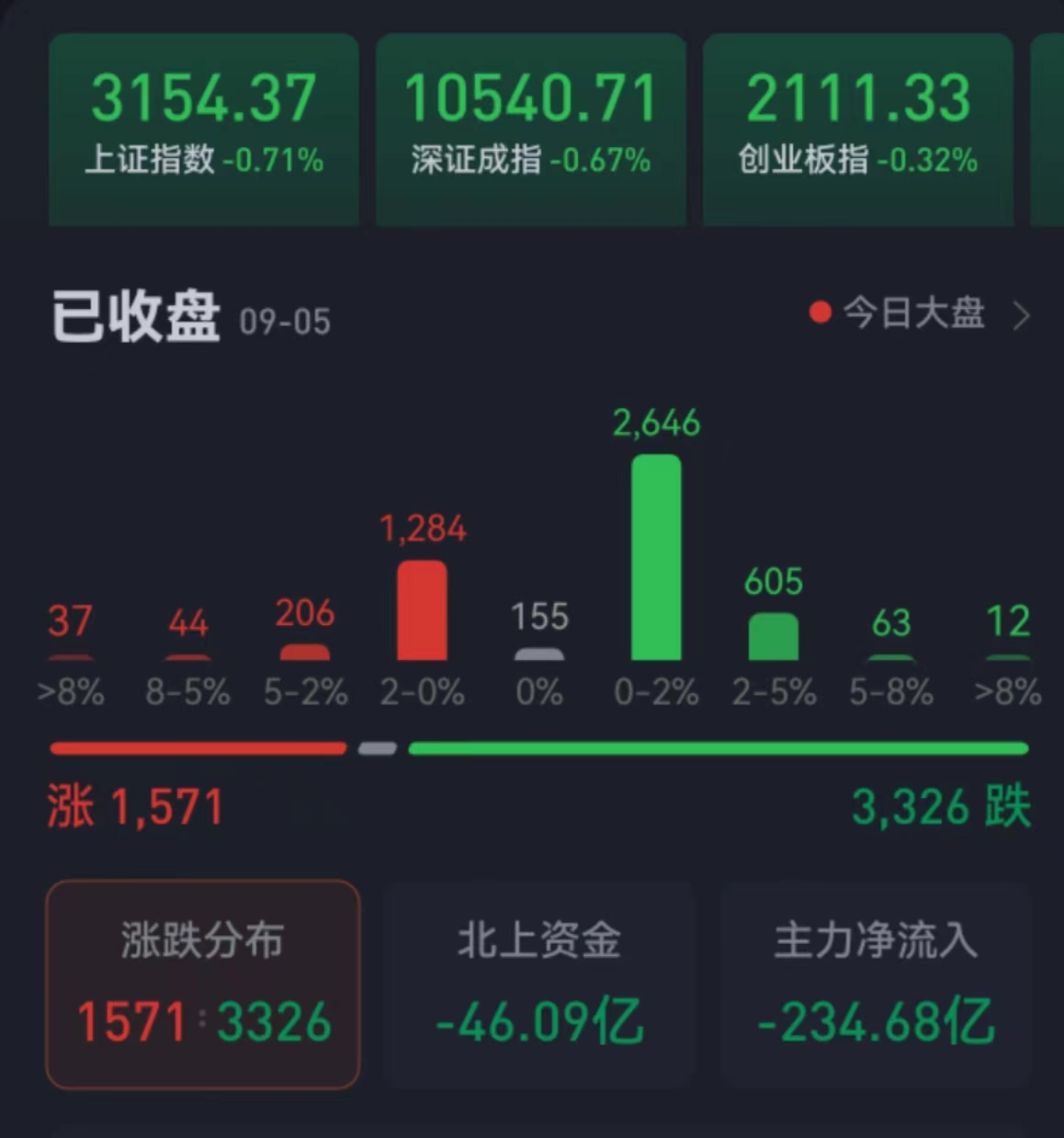 周二(9月5日),A股三大股指震蕩回落。截至收盤,上證指數(shù)跌0.71%報(bào)3154.37點(diǎn),深證成指跌0.67%報(bào)10540.71點(diǎn),創(chuàng)業(yè)板指跌0.32%報(bào)2111.33點(diǎn);兩市合計(jì)成交金額達(dá)8038.57億元,北向資金凈賣出46.09億元??傮w上看,兩市個(gè)股跌多漲少。其中,漲停個(gè)股達(dá)23只,跌停個(gè)股達(dá)5只。