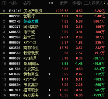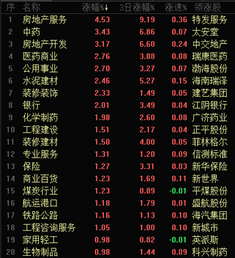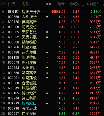 截至午間收盤,房地產(chǎn)領(lǐng)域領(lǐng)漲,細(xì)分行業(yè)房地產(chǎn)服務(wù)以4.53%的漲幅居?xùn)|方財(cái)富行業(yè)漲幅榜首、房地產(chǎn)開發(fā)則以3.17%位居第三。
