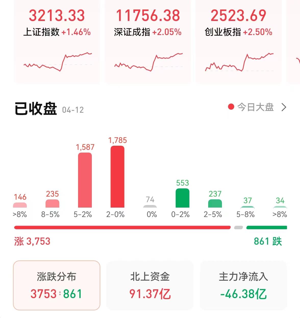 反抽普漲!周二(4月12日),A股三大指數(shù)全線飄紅,滬指重返3200點(diǎn),創(chuàng)業(yè)板指也成功站上2500點(diǎn)。熱點(diǎn)方面,住宿餐飲、旅游酒店、白酒和券商等板塊紛紛走強(qiáng),逾百股漲停。與此同時(shí),北上資金大幅涌入超90億元,A股的反彈行情能否就此開啟呢?