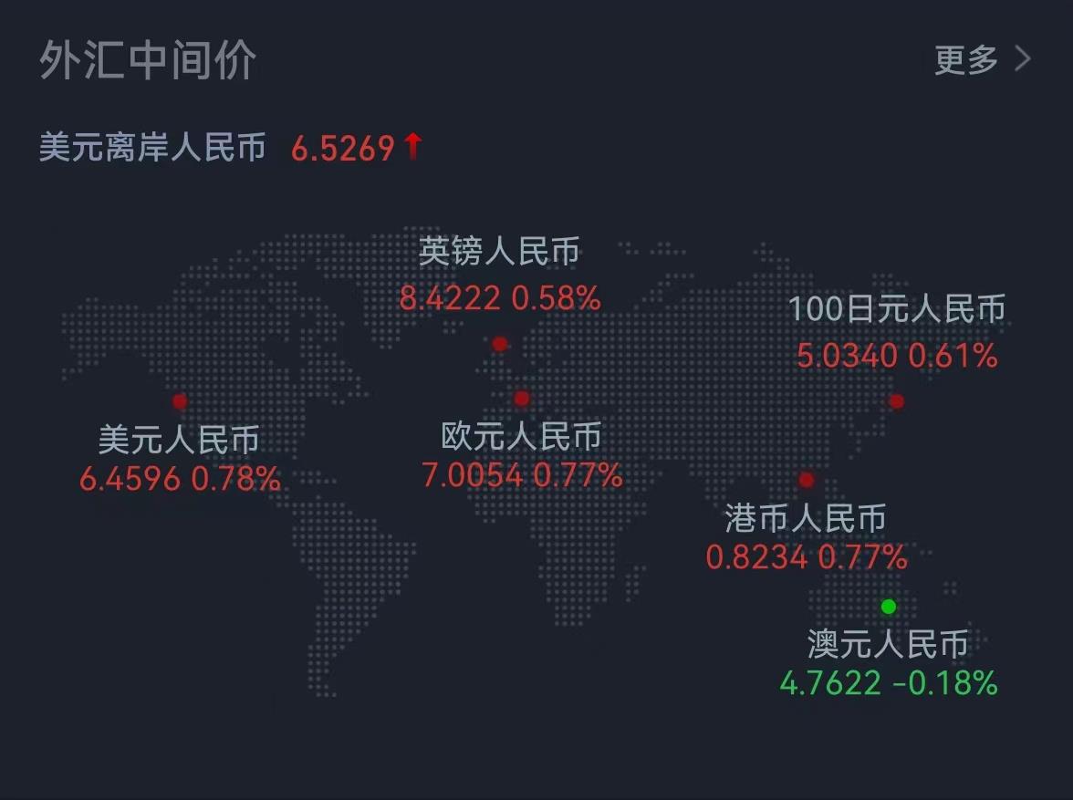 周五,人民幣兌美元中間價調(diào)貶498個基點,報6.4596,創(chuàng)去年10月13日來新低,本周累計調(diào)貶700個基點。在岸人民幣兌美元16:30收盤報6.4875,較上日跌375個基點,本周累跌1163個基點;夜盤收報6.5016,較上日夜盤收跌495個基點。