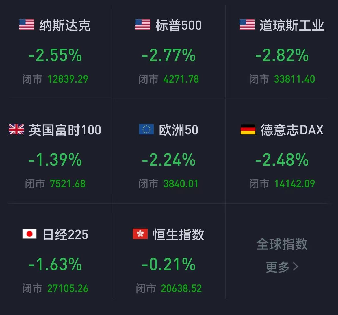 本周,道指跌1.86%,標普500指數(shù)跌2.75%,納指跌2.55%。