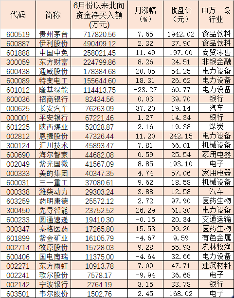 表:6月份以來(lái)受到北向資金青睞的個(gè)股