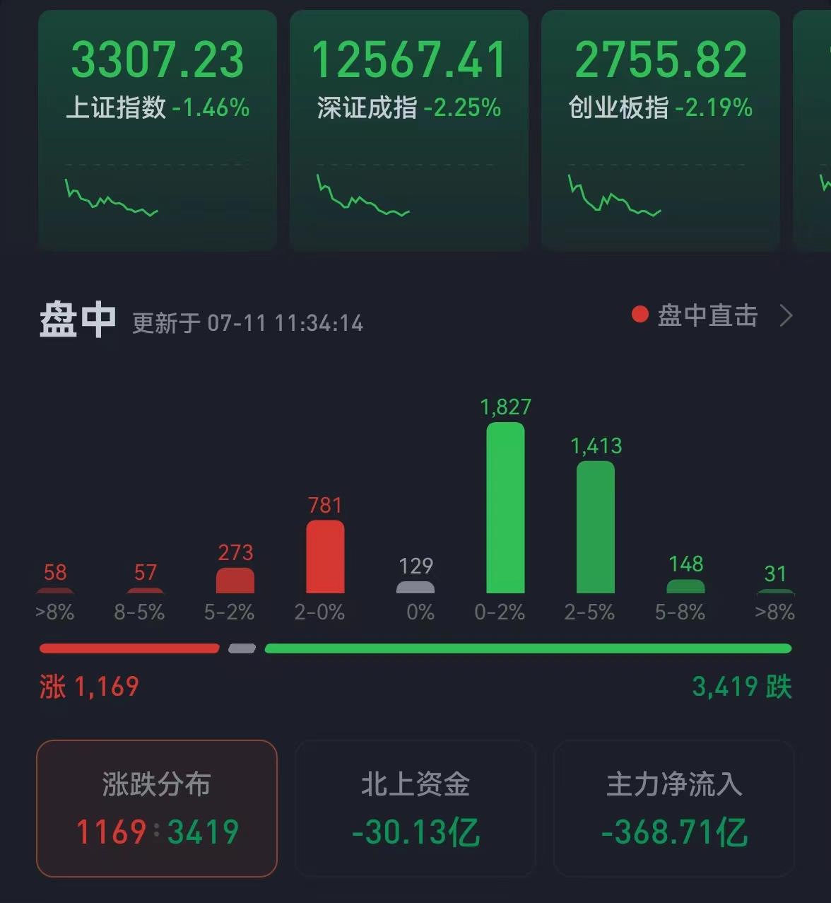 周一(7月11日),三大股指震蕩回落,全線收陰,跌幅均超1%。截至上午收盤,上證指數(shù)跌幅達(dá)1.46%,報(bào)3307.23點(diǎn),險(xiǎn)守3300點(diǎn)整數(shù)關(guān)口;深證成指和創(chuàng)業(yè)板指跌幅分別為2.25%和2.19%;滬深兩市合計(jì)成交額6683.4億元;總體來看,兩市個(gè)股跌多漲少,上漲個(gè)股1169只,有3419只個(gè)股下跌。