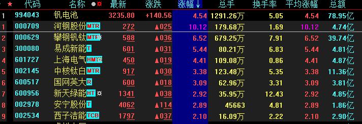 具體來看,7月11日上午,釩電池板塊異軍突起,漲幅達(dá)4.54%,其中,河鋼股份直沖漲停,攀鋼釩鈦、易成新能等概念股漲幅均超5%。